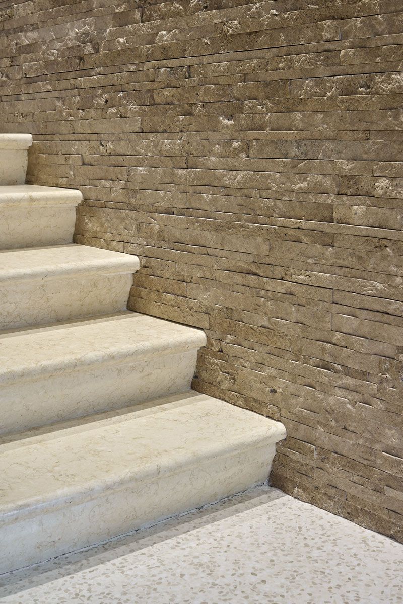 Il rivestimento in Spaccatello Travertino Noce può essere posato sia all’interno che all’esterno. Ricrea uno scenario naturale che fa rivivere la terra e il suo habitat, in un contesto rinnovato che mantiene un dialogo continuo di rimandi a colori, forme, impronte pure e autentiche del sottosuolo.