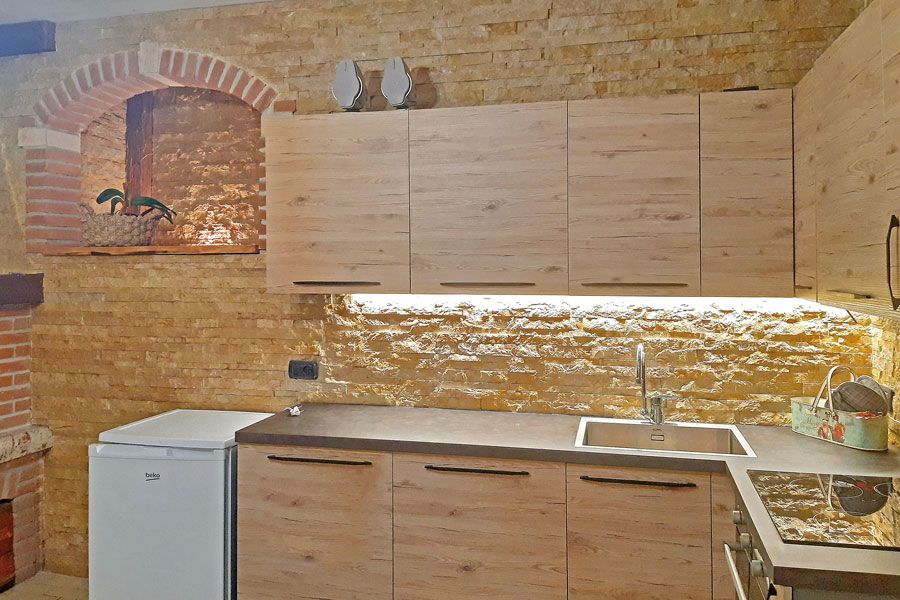 Il rivestimento in listelli di marmo o pietra è consigliato come para schizzi o alzata della cucina. Essendo un materiale naturale non gelivo e resistente alle temperature, rimane integro e non cambia colore negli anni. È ignifugo e sicuro per la salute e per l’ambiente circostante, poiché non contiene sostanze tossiche.