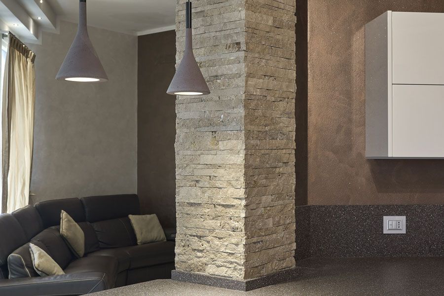 Questo elemento verticale può acquistare un valore estetico di grande pregio grazie allo spaccatello. Infatti, qualsiasi sia la sua posizione, sul solaio, nella zona giorno, all’ingresso, i listelli con una faccia a spacco e l’angolo, ugualmente rifinito, possono rivestire tutte le colonne a base quadrata e rettangolare.