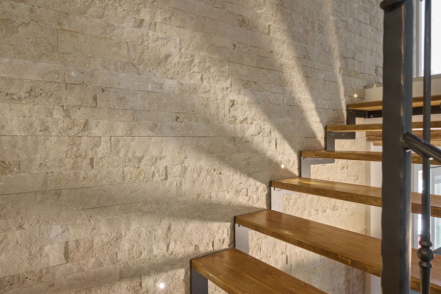 La posa dei nostri tranciati spaccati su un solo lato è una soluzione scelta da tante persone, poiché il nostro spaccatello finito è sottile e leggero. Perciò, è molto versatile e prende la forma delle scale, delle colonne che sorreggono il corrimano o la parete che unisce i vari piani.